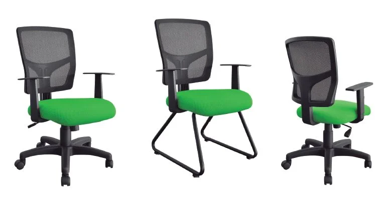 EK – 100 Base em aço com capa plástica, mecanismo ergonômico, assento estofado, encosto tela com apoio lombar, braços ajustáveis.