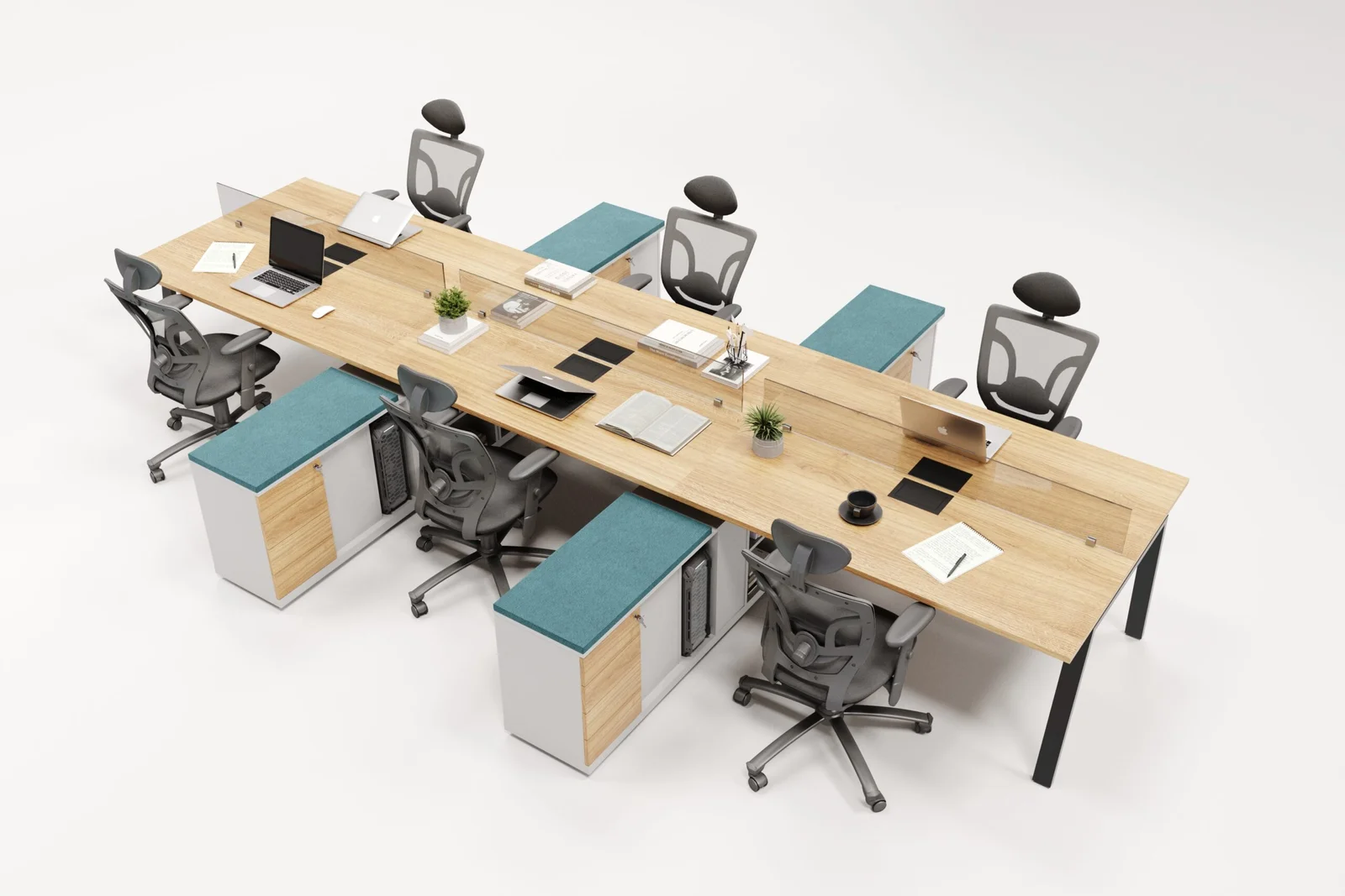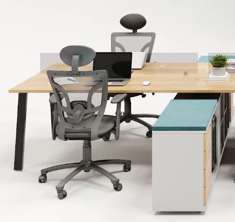 A Plataforma de Trabalho com Divisórias e Gaveteiro oferece conforto e praticidade para equipes em ambientes corporativos. Seu design funcional possibilita o uso compartilhado do espaço sem comprometer a privacidade, graças às divisórias centrais que delimitam as estações.
