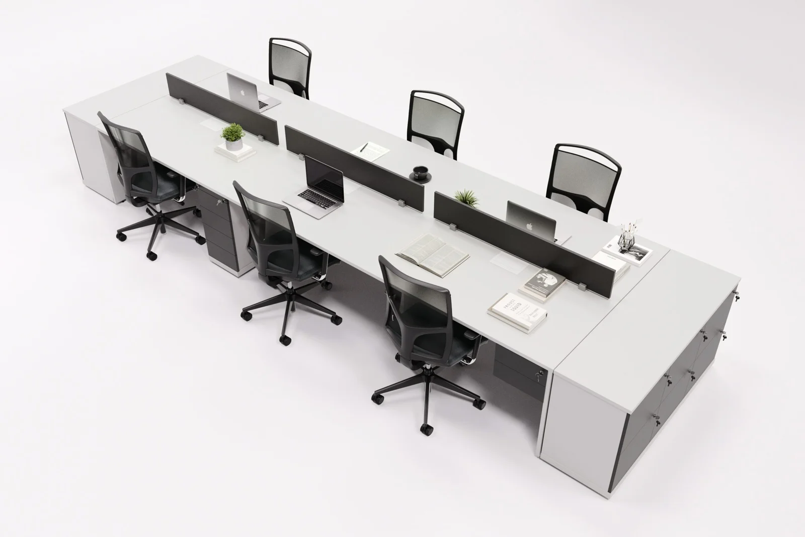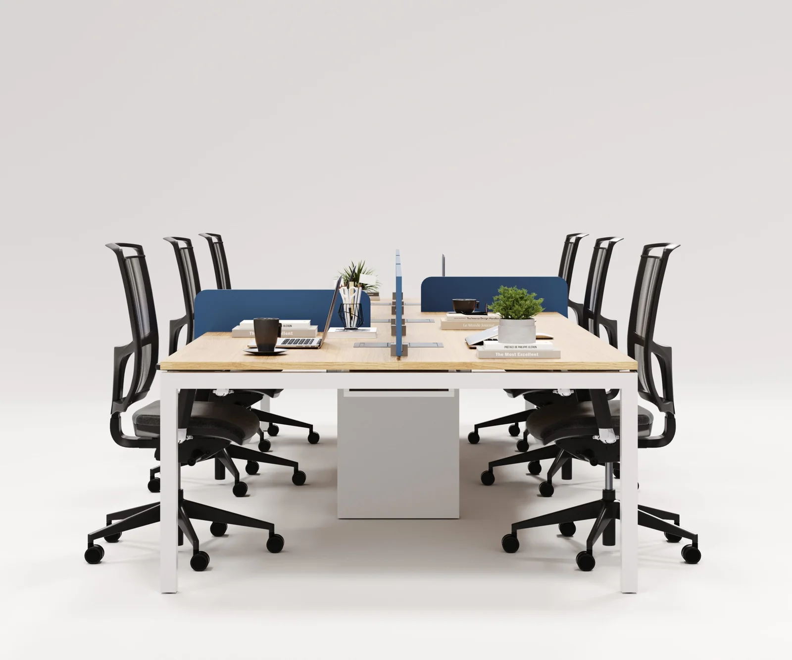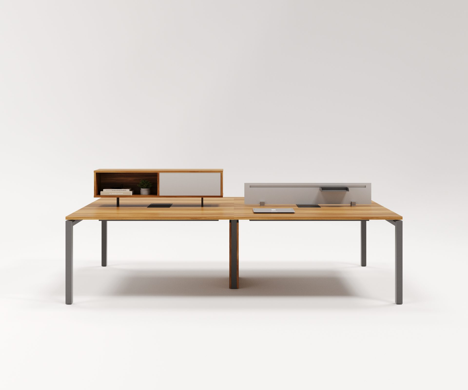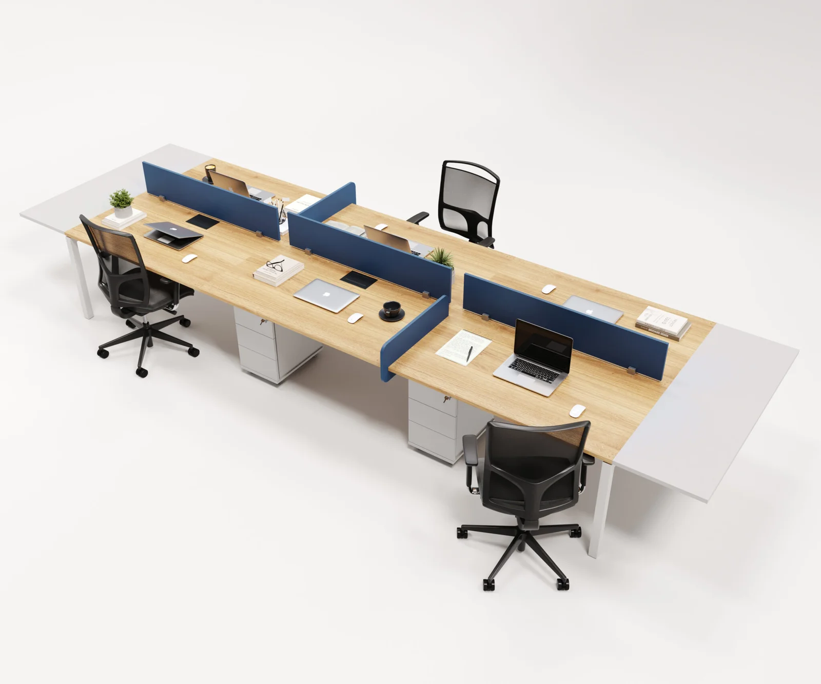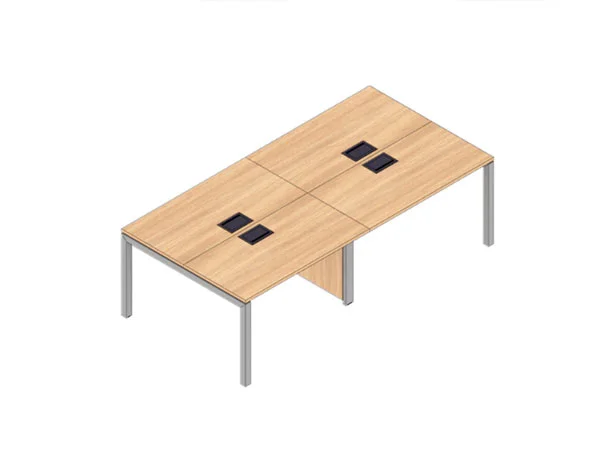 O tampo espaçoso, aliado à divisória central, cria estações confortáveis e bem definidas, ideais para equipes que necessitam de concentração e praticidade no dia a dia.