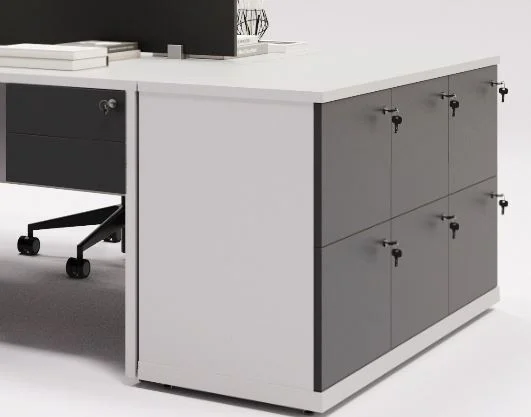 Nessa configuração, além de uma estrutura mais robusta, temos um amplo espaço de armazenamento. É possível ter, próximo ao ambiente de trabalho, itens e documentos que são mais utilizados no dia a dia, na rotina do escritório.