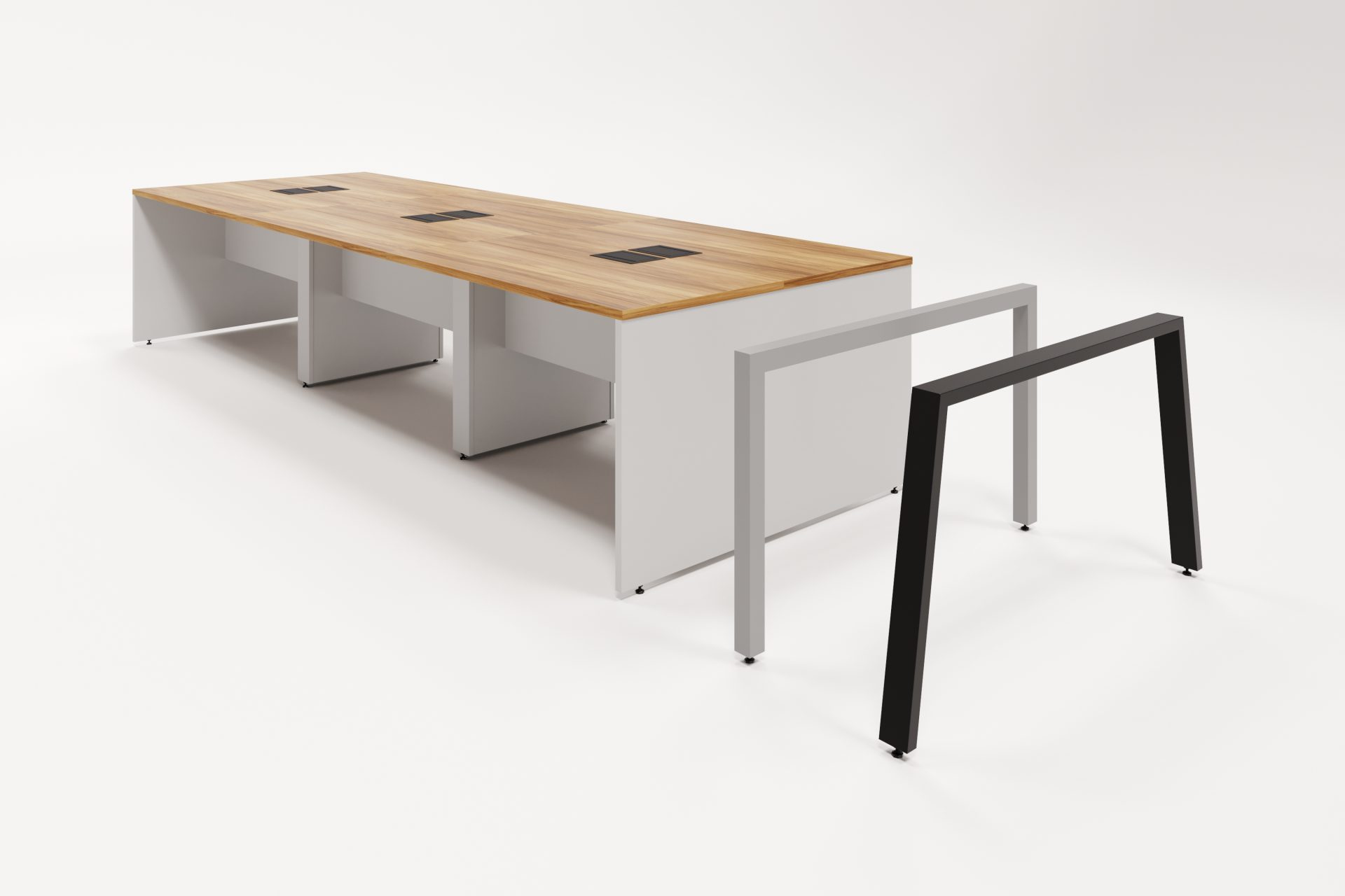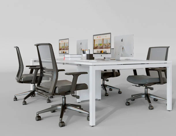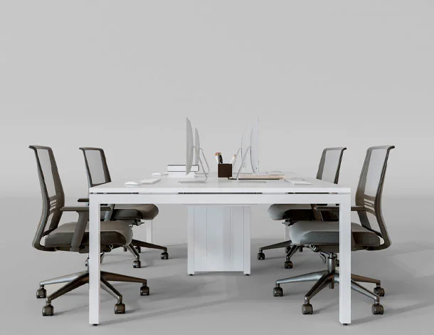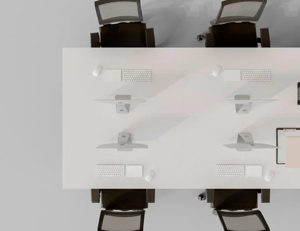 Seu design minimalista se adapta facilmente a diferentes configurações — desde estações duplas até grandes plataformas coletivas — permitindo layout flexível conforme a necessidade do projeto.