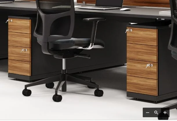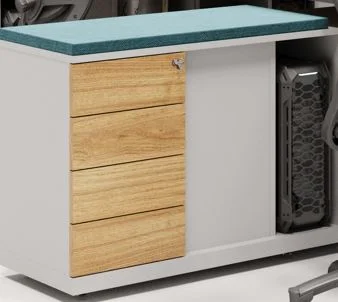 Os gaveteiros integrados proporcionam armazenamento eficiente de materiais e documentos, enquanto a estrutura modular permite diversas configurações conforme a necessidade do projeto.